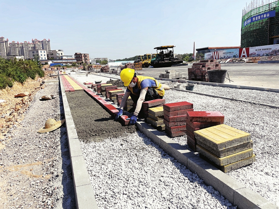昨日,在市区东粤路项目文才村路段施工现场,施工人员假期坚守岗位,加紧铺设人行道彩砖,争取项目工程早日完工。