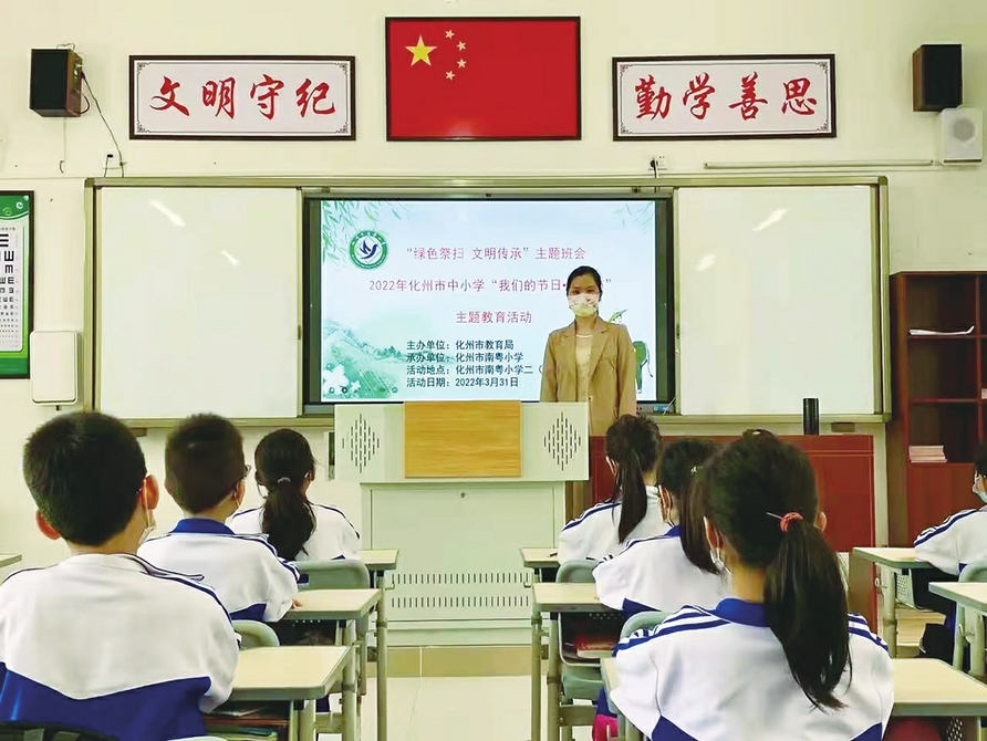清明节来临之际,化州市各中小学根据化州市教育局的部署,结合实际,通过发动师生开展网上祭扫,组织主题班会课、征文比赛、校园广播、手抄报大赛等形式开展绿色纪念活动,巩固和拓展疫情防控形势持续向好的态势,大力倡导绿色、文明、简约的祭扫新风尚,教育引导学生缅怀先烈,铭记历史,争做时代新人。