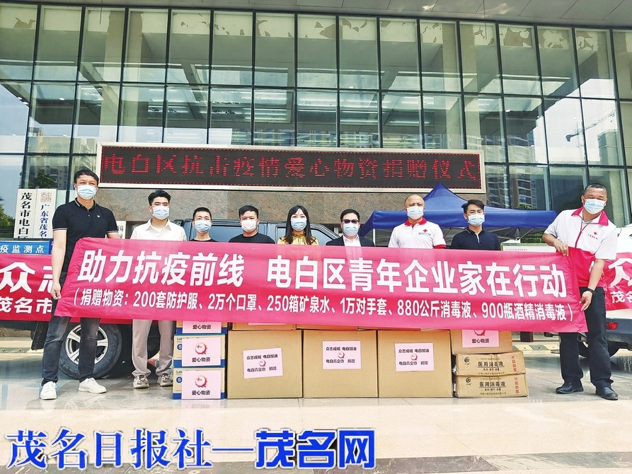 4月7日,电白区青年企业家向电白区红十字会捐赠物资包括200套防护服、2万个口罩、250箱矿泉水、1万双手套、880公斤消毒液、900瓶酒精消毒液;此外,广东城市建设集团有限公司、广西中惠投资集团有限公司、北海阳光宝城房地产有限公司等21家爱心企业和崔立伟、肖钦华、王明旺等7名爱心企业家共向电白区红十字会捐赠医用口罩和隔离面罩262400个、N95口罩211600个、移动电源200个、医用防护屏5000个、防护服3815套、防护消毒液360支、防护手套150300对、5KM含氯消毒液30件、75%酒精50件、免洗手消毒液205瓶、智能语音测温器60个和现金520000元。