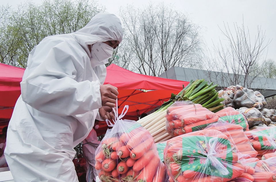 4月11日,在中国供销农产品(沈阳)集配中心,沈抚改革创新示范区志愿者在分拣蔬菜。