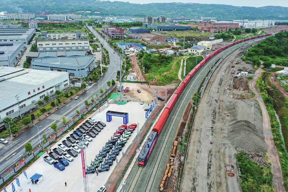 4月14日,长城汽车专列首发列车在重庆永川国家高新区铁路专用线上等待发车(无人机照片)。新华社记者唐奕摄