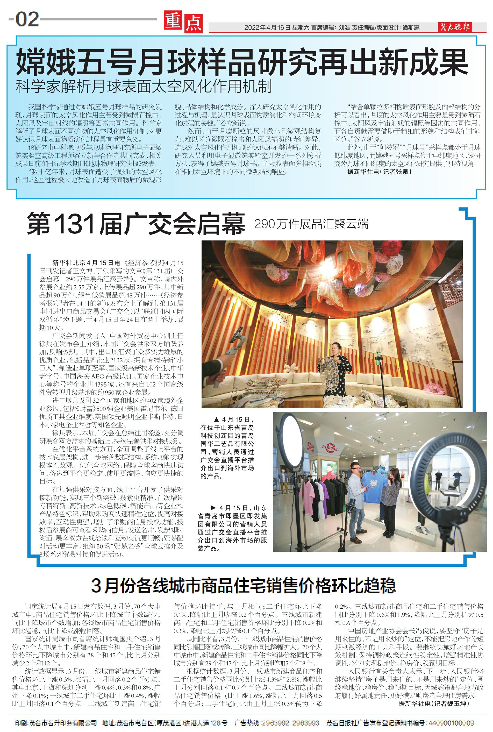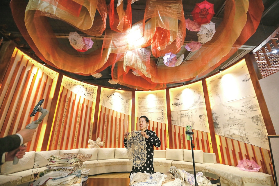 4月15日,在位于山东省青岛科技创新园的青岛国华工艺品有限公司,营销人员通过广交会直播平台推介出口到海外市场的产品。