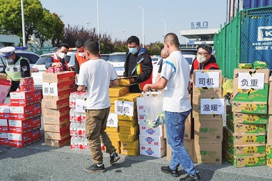 上海交通部门、上海市交通运输行业协会集装箱分会联合上海市慈善基金会为集卡司机提供食物。 新华社记者王辰阳摄(4月7日摄)