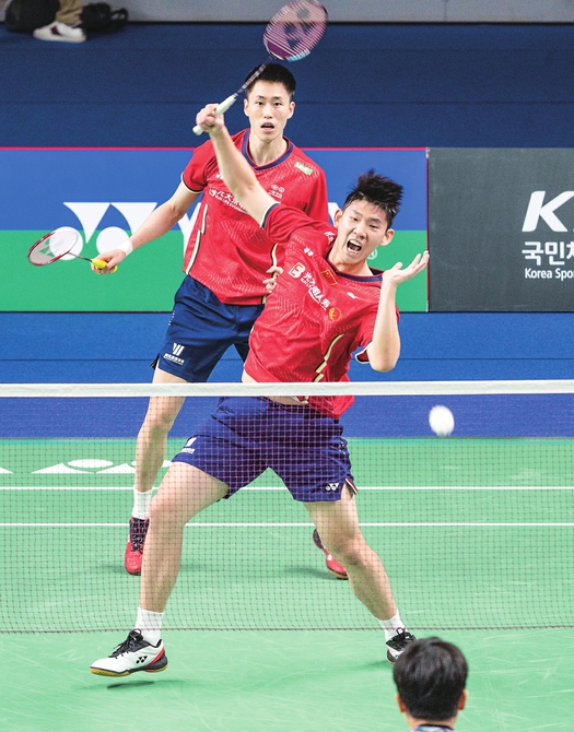 男双组合刘雨辰/欧烜屹以21:19和21:16击败韩国组合崔率圭/金元昊,晋级决赛。