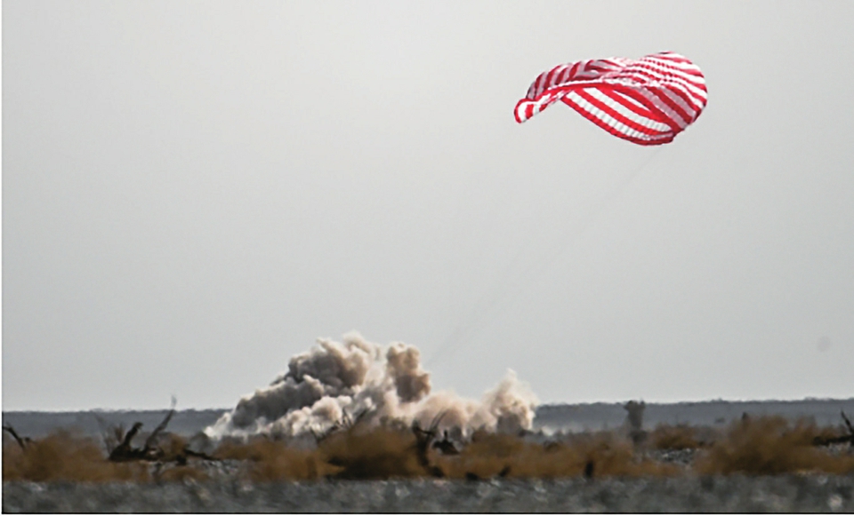 2022年4月16日,神舟十三号载人飞船返回舱在东风着陆场成功着陆。新华社记者连振摄