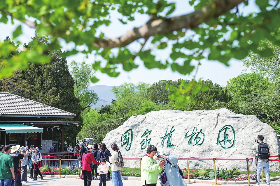 4月18日,游客在国家植物园入口处参观。新华社记者鞠焕宗摄