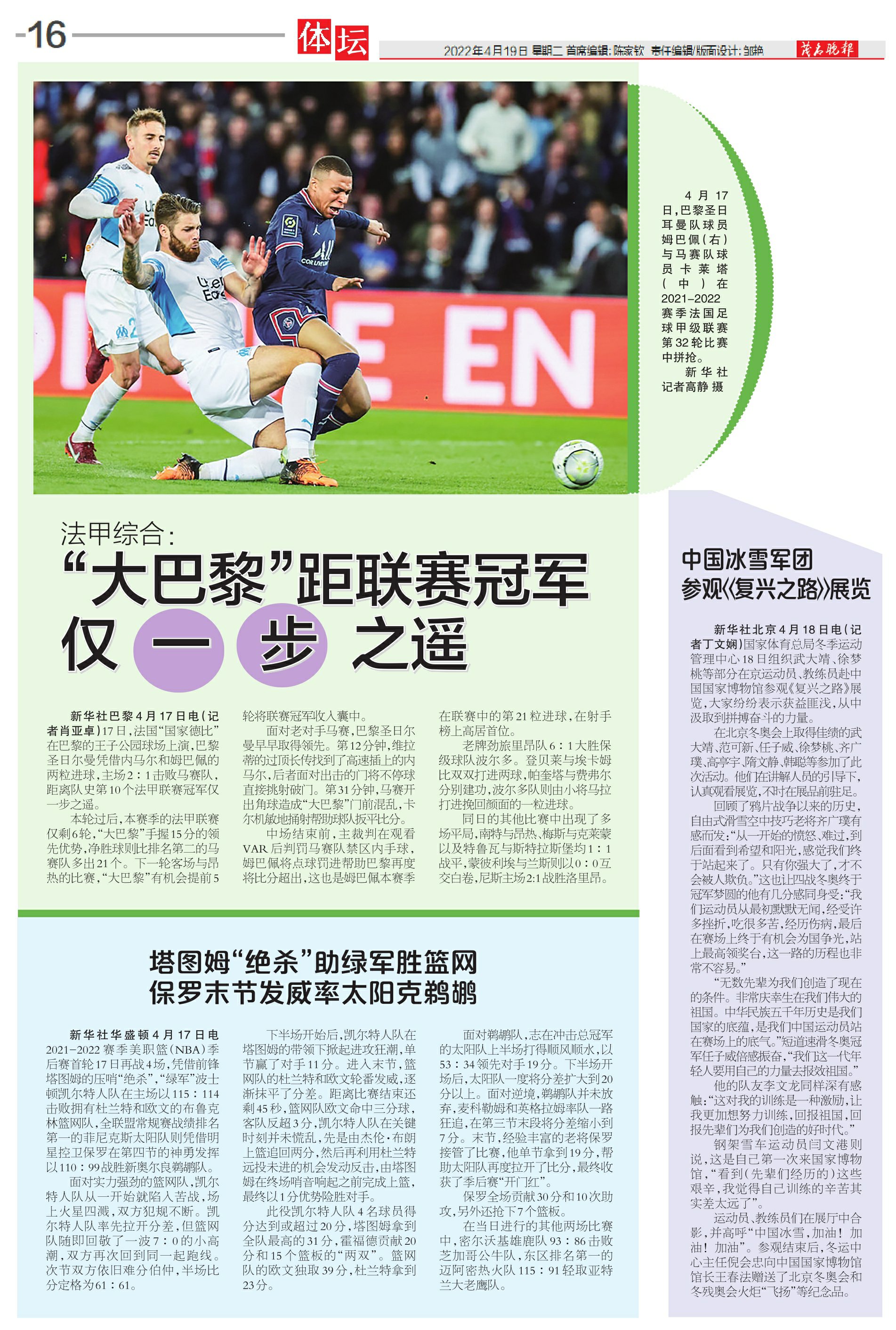 法甲综合:“大巴黎”距联赛冠军仅 一 步 之遥