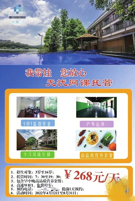 “现在早教班、兴趣班一节课都不止两百元了,这还一人一间房管三餐饭,我们做父母的白天都上班,把孩子放在这边做做作业休息一下也无妨。”佛山一名12岁孩子的家长告诉记者,他在网上看到宣传后和几位好友一同报名了。
