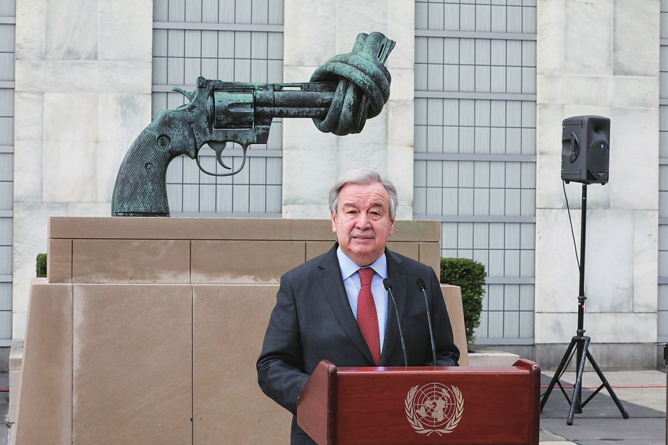 4月19日,联合国秘书长古特雷斯在纽约联合国总部标志性雕塑“打结的手枪”前对记者发表谈话。新华社记者谢锷摄