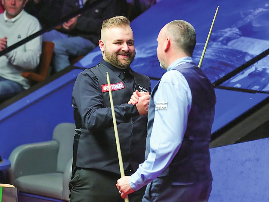 威廉姆斯(右)与佩奇(左)在斯诺克世锦赛16强之战中握手。图片来源于世界斯诺克巡回赛官网