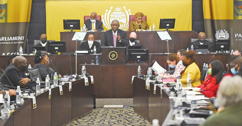 4月26日,在南非立法首都开普敦,南非总统拉马福萨(中)在议会两院关于洪灾的全体会议上讲话。新华社发(哈比索·姆卡贝拉摄)