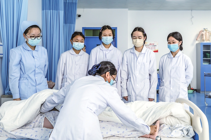 ▲4月27日,学生在贵州省黔西市中等职业学校进行中医护理技能实训。 新华社发(范晖摄)