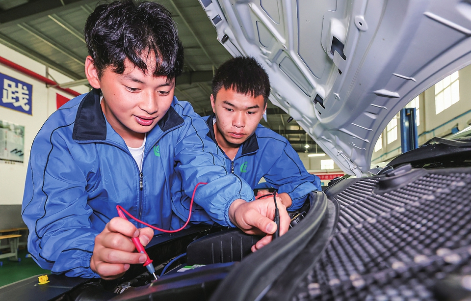 ▲4月27日,在贵州省黔东南苗族侗族自治州岑巩县中等职业学校,学生在实训室学习汽车修理技术。新华社发(胡攀学摄)