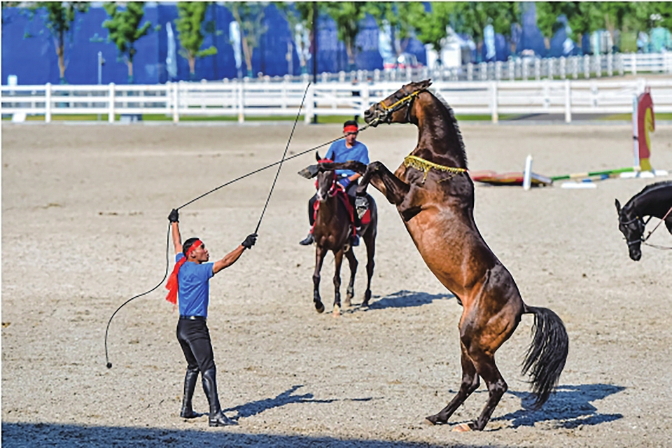 图为驯马师正在全运会马术比赛主场地进行驯马表演。新华社记者刘彤摄