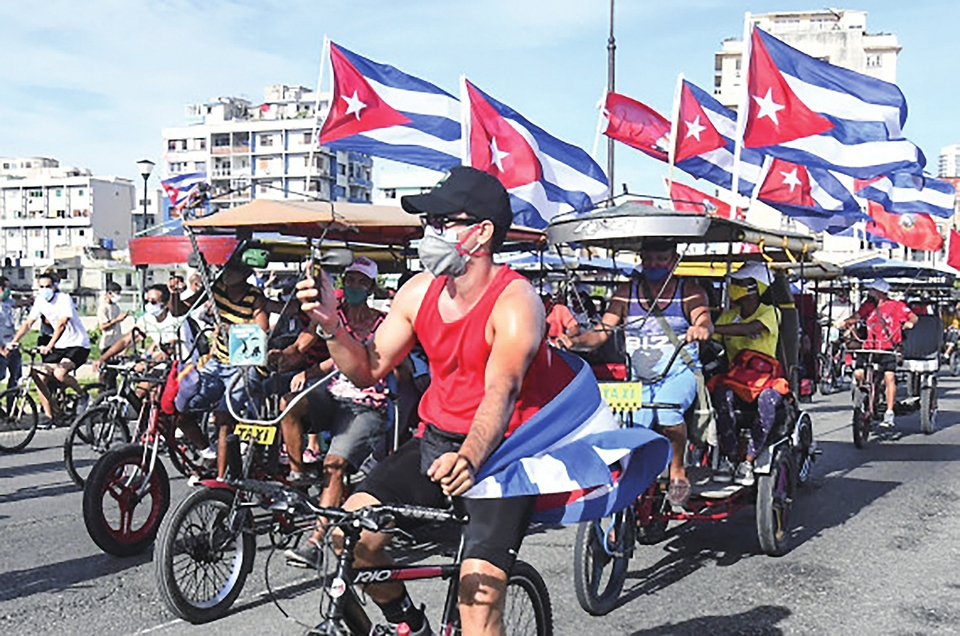 2021年8月5日,数百名古巴青年在首都哈瓦那举行保卫 国 家 和平、团结反美游行,要求美国解除对古巴近60年的封锁。 新华社发(华金·埃尔 南 德 斯摄)