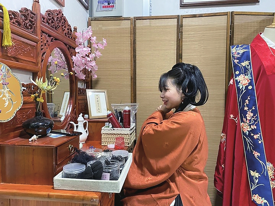 舒秋红在自己的汉服店里梳妆。新 华 社 记者 张昕怡摄