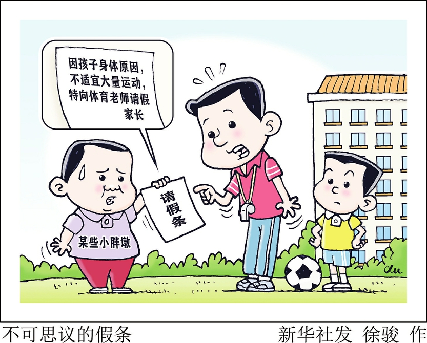最近几年,在天津市一所小学担任体育教师的王老师经常收到家长一些不可思议的请假条:因孩子身体原因,不适宜大量运动,特向体育老师请假。王老师便把这几个较胖的孩子叫到队伍外休息。