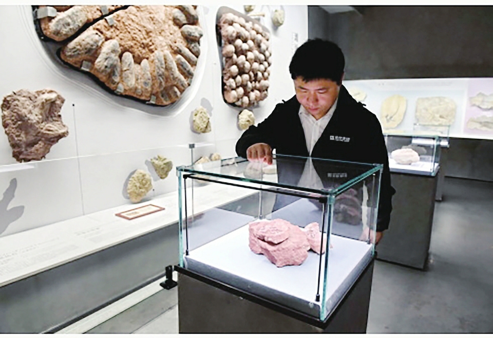 在福建省英良石材自然历史博物馆陈列的一组鸭嘴龙胚胎化石(5月11日摄)。新华社记者林善传摄