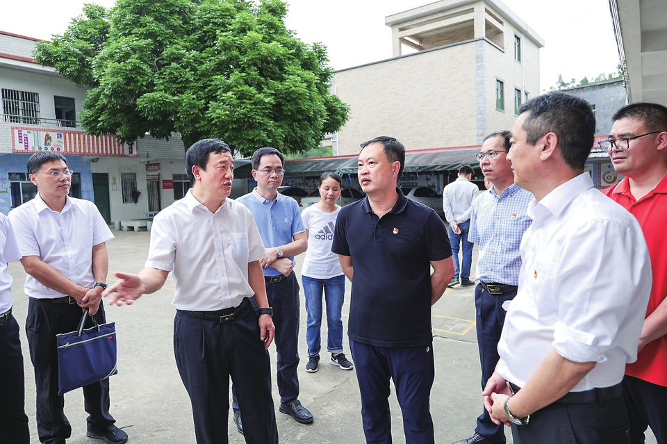 帮扶单位领导在大坡镇白马小学考察拟援助的综合维修工程项目。茂名日报社全媒体记者孙广宇 摄
