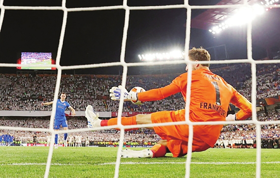 新华社马德里5月18日电(谢宇智)2021-2022赛季欧联杯决赛18日在西班牙塞维利亚举行。德国球队法兰克福苦战120分钟,凭借点球大战击败苏格兰球队格拉斯哥流浪者,历史上第二次捧得欧联杯冠军。