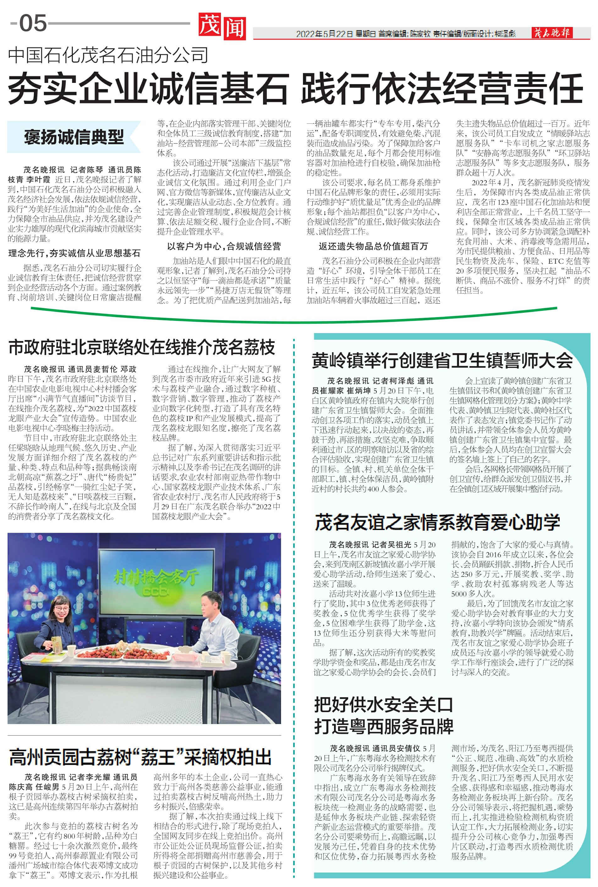 2022年4月,茂名新冠肺炎疫情发生后,为保障市内各类成品油正常供应,茂名市123座中国石化加油站和便利店全部正常营业,上千名员工坚守一线,保障全市区域各类成品油正常供应。同时,该公司多方协调紧急调配补充食用油、大米、消毒液等急需用品,为市民提供粮油、方便食品、日用品等民生物资及洗车、保险、ETC充值等20多项便民服务,坚决扛起“油品不断供、商品不涨价、服务不打烊”的责任担当。