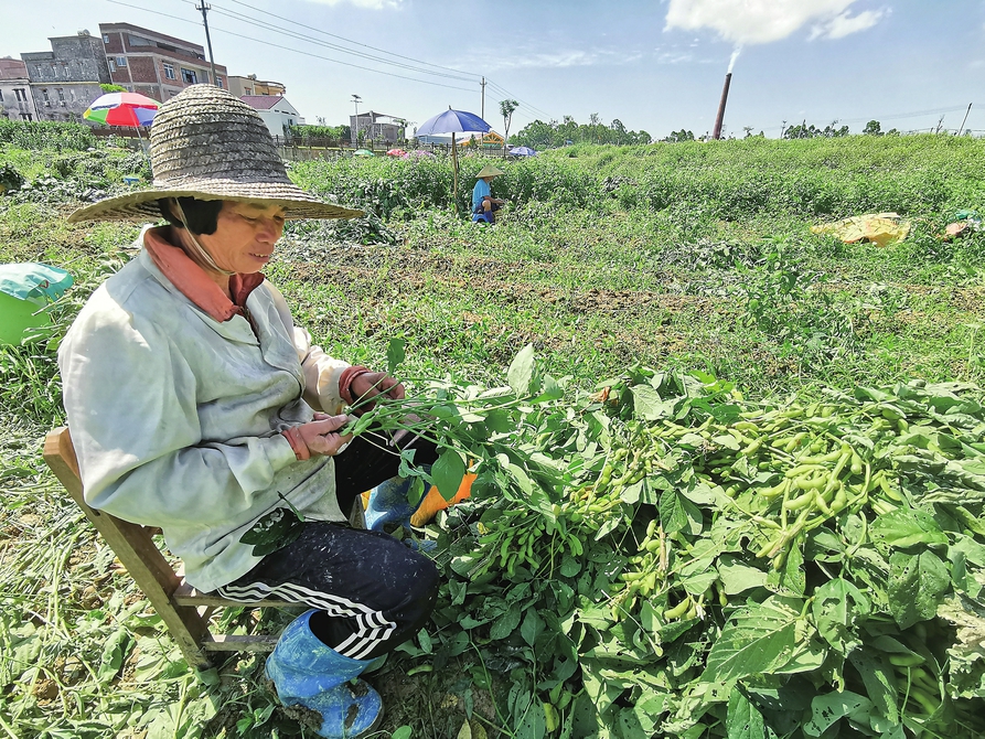 每天和黄梅珍一样来采摘毛豆的村民还有很多,大部分是潭头村村民。据悉,2021年,村里进行土地流转,村民把家里的土地按每亩每年1000元的租金流转给基地。村民通过土地流转可以领到租金,平时还到基地务工,做些播种、施肥、除草等田间管理工作,一天也能挣近百元。现在又到了毛豆收获季节,收入就更高了。