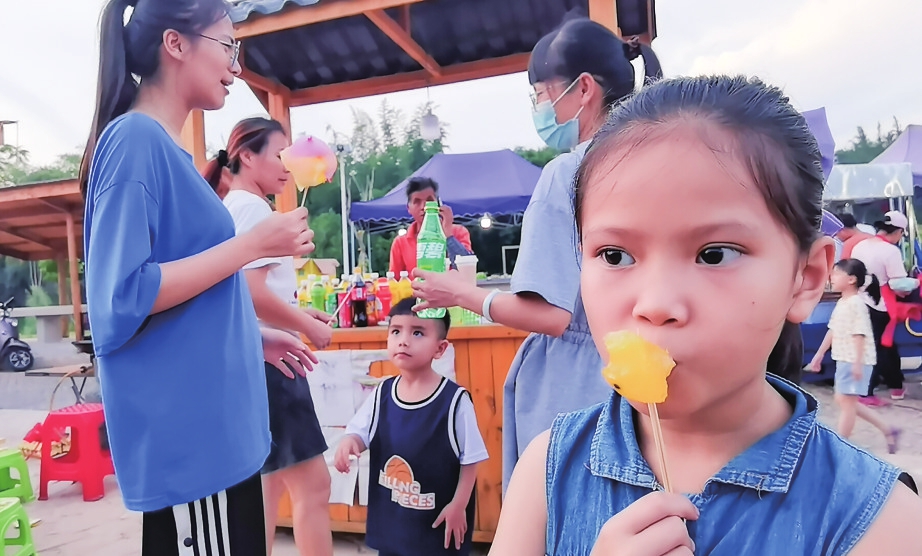 记者粗略数了一下,乡村集市里面的摊档超过30个,经营范围包括烧烤、糖水、卡拉OK、特色小吃、儿童玩乐、涂画等。其中,有最少5家烧烤档、4家糖水档,特色小吃档,包括臭豆腐、手抓饼、炸豆饼角、蚝炸、铁板烧、钵仔糕等多种外地、本地驰名小吃。儿童玩乐的档口有捞鱼、钓鱼、套圈、涂画等项目,还有2档卡拉OK,5元唱一首歌。