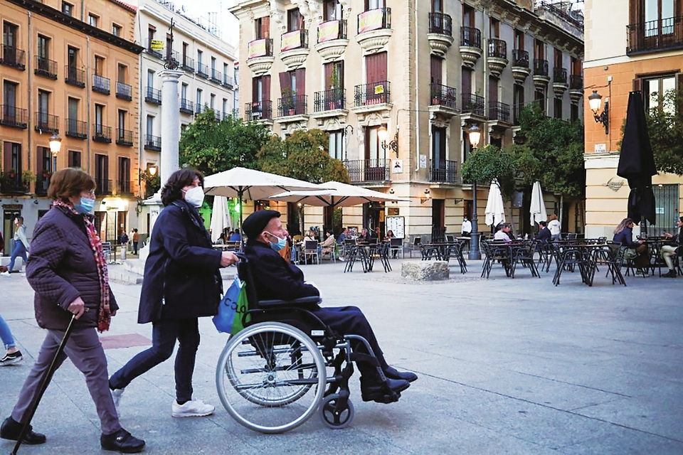2021年10月25日,戴口罩的行人走过西班牙马德里市中心。新华社记者孟鼎博摄
