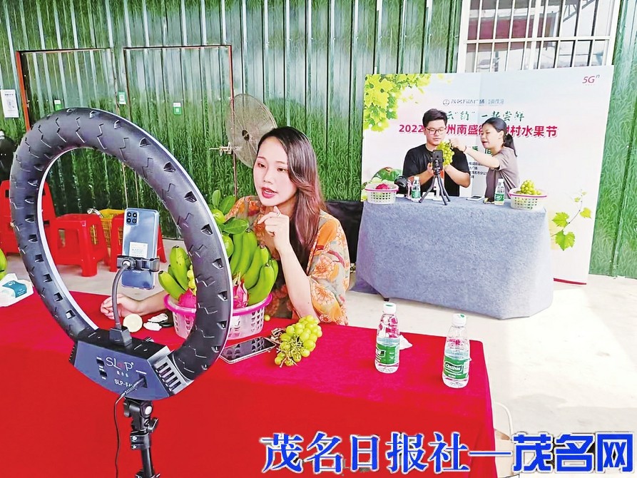 直播达人现场开播带货,展示谢村的特色水果。茂名晚报记者梁奈摄