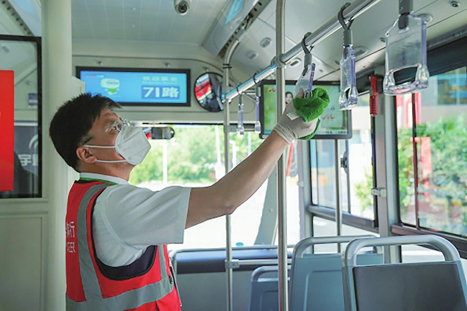 5月22日,工作人员在上海市某公交车上为抓手消毒。(新华社记者王辰阳摄)