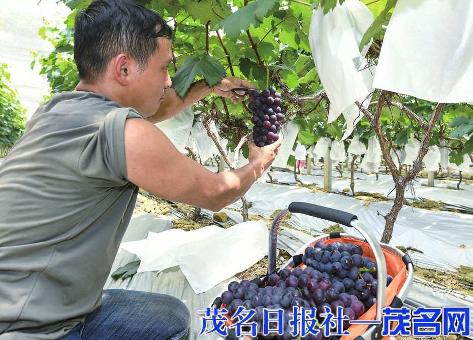 果农在采摘成熟的“黑玫瑰”葡萄。茂名日报社全媒体记者甘杨松摄