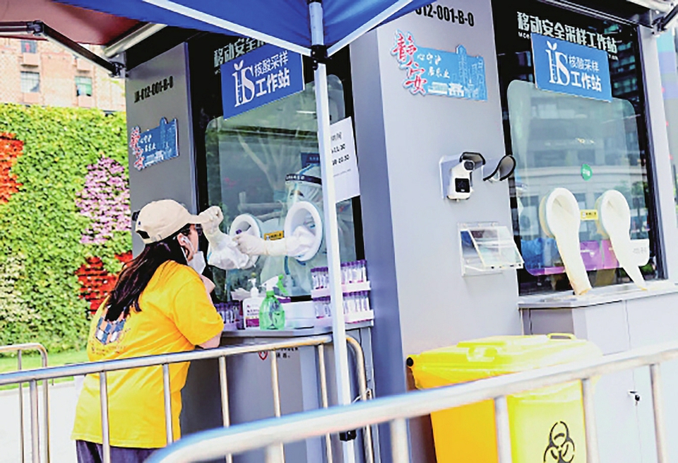 6月1日,市民在上海市南京西路一处常态化核酸采样点进行核酸采样。新华社记者陈飞摄