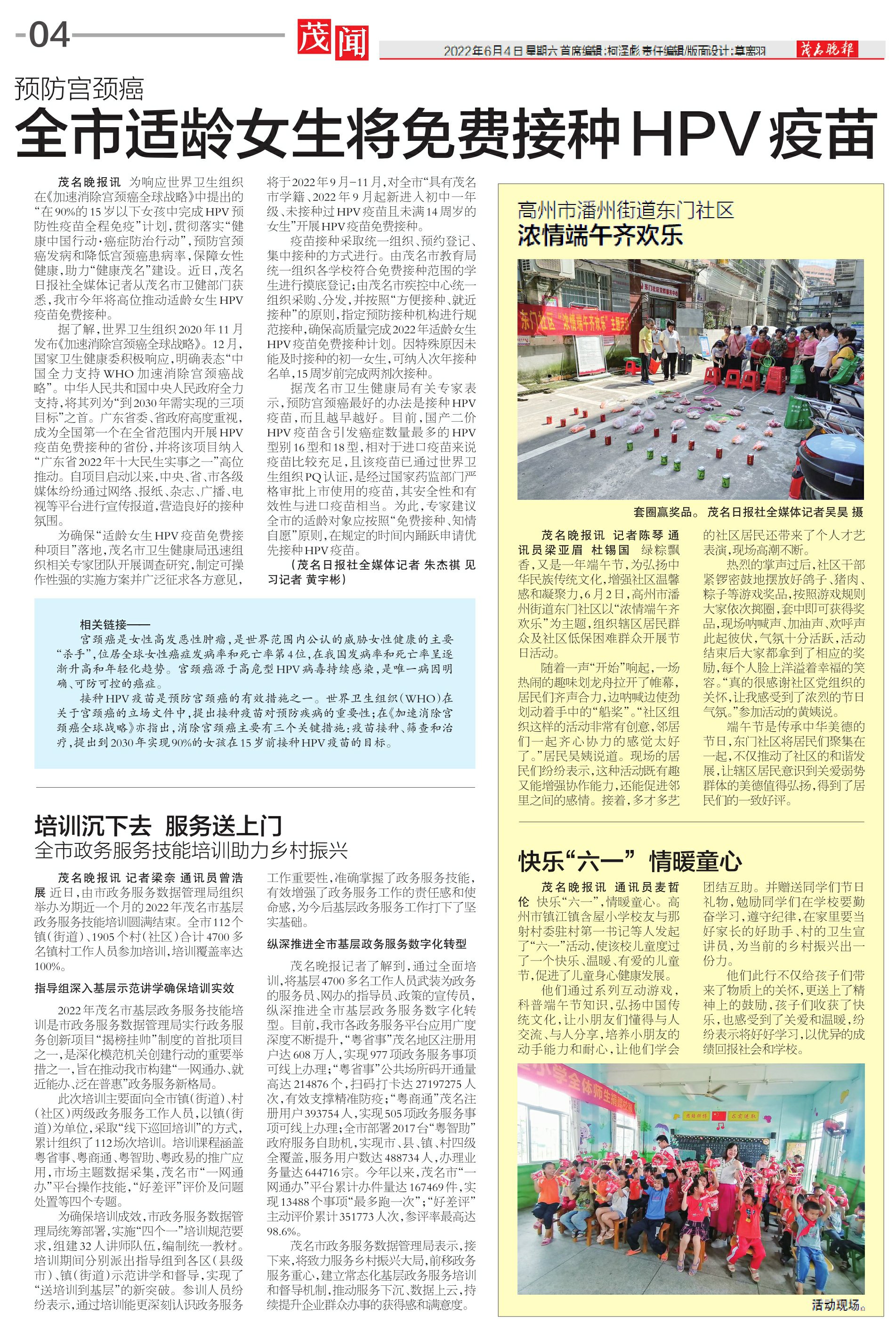 茂名晚报讯 为响应世界卫生组织在《加速消除宫颈癌全球战略》中提出的“在90%的15岁以下女孩中完成HPV预防性疫苗全程免疫”计划,贯彻落实“健康中国行动·癌症防治行动”,预防宫颈癌发病和降低宫颈癌患病率,保障女性健康,助力“健康茂名”建设。近日,茂名日报社全媒体记者从茂名市卫健部门获悉,我市今年将高位推动适龄女生HPV疫苗免费接种。