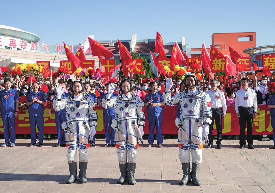 6月5日,神舟十四号载人飞行任务航天员乘组出征仪式在酒泉卫星发射中心问天阁广场举行。陈冬(右)、刘洋(中)、蔡旭哲即将开启为期6个月的飞行任务。 新华社记者李刚摄
