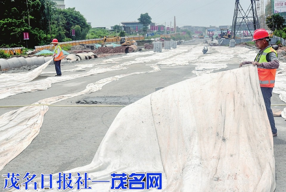昨日,在市区双山八路施工现场,施工人员正在进行路面水稳层养护施工。据了解,目前路面大部分已完成水稳层铺设,即将进行铺设沥青。茂名日报社全媒体记者陈国汉摄