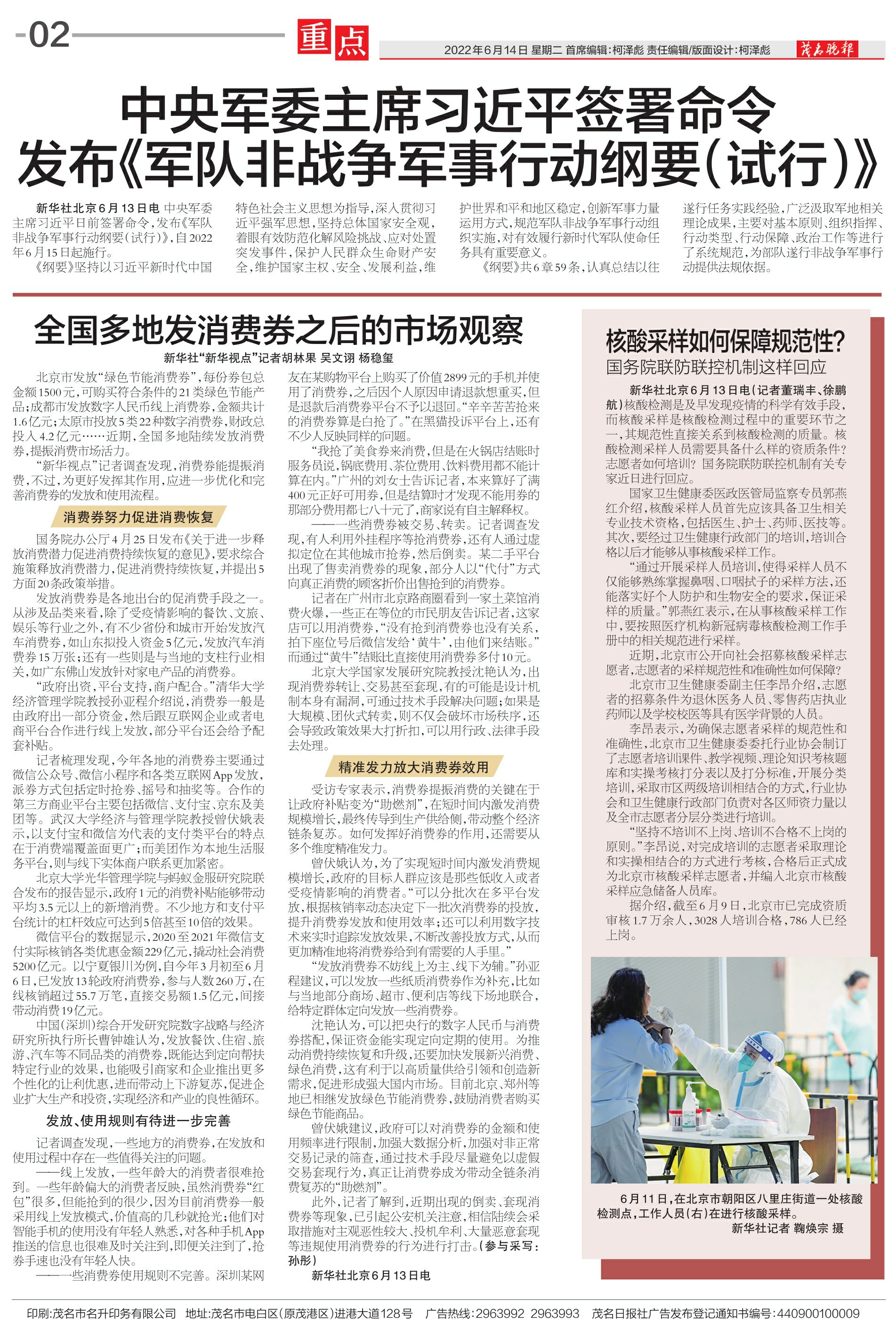 中央军委主席习近平签署命令发布《军队非战争军事行动纲要(试行)》
