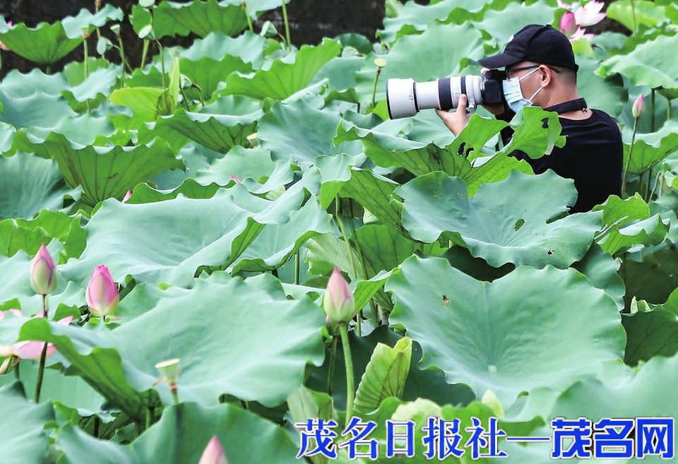 昨天上午,茂名晚报记者在茂南区新坡镇合水城市生态湿地公园看到,园内的荷塘已有不少荷花盛开,微风吹过,粉红色的花朵在青翠的荷叶间摇曳生姿,美如袅娜起舞的少女。荷叶之不染,荷花之高雅,尽在眼前,叫人心清意净,忘却尘世烦忧。不少游客闻讯前来,时而凭栏静望,时而逐风摄花。虽置身于烈日炎炎下,却是神清气爽、优哉游哉。
