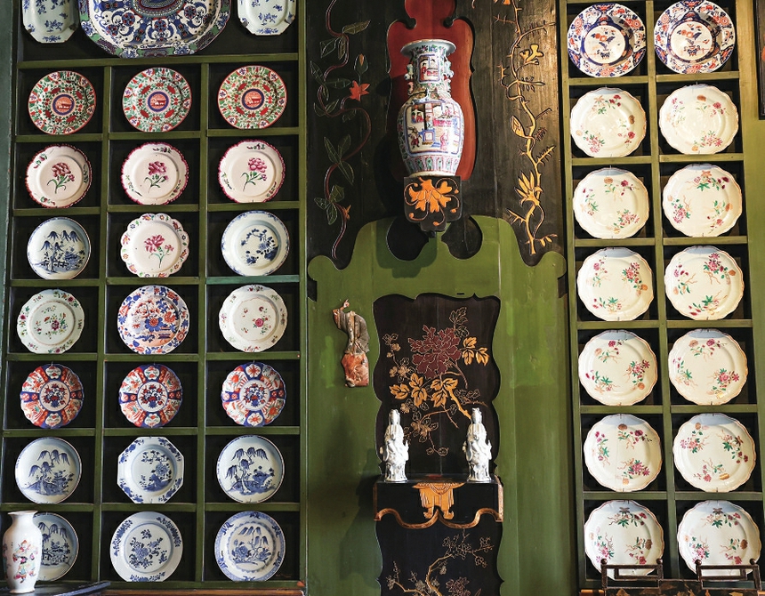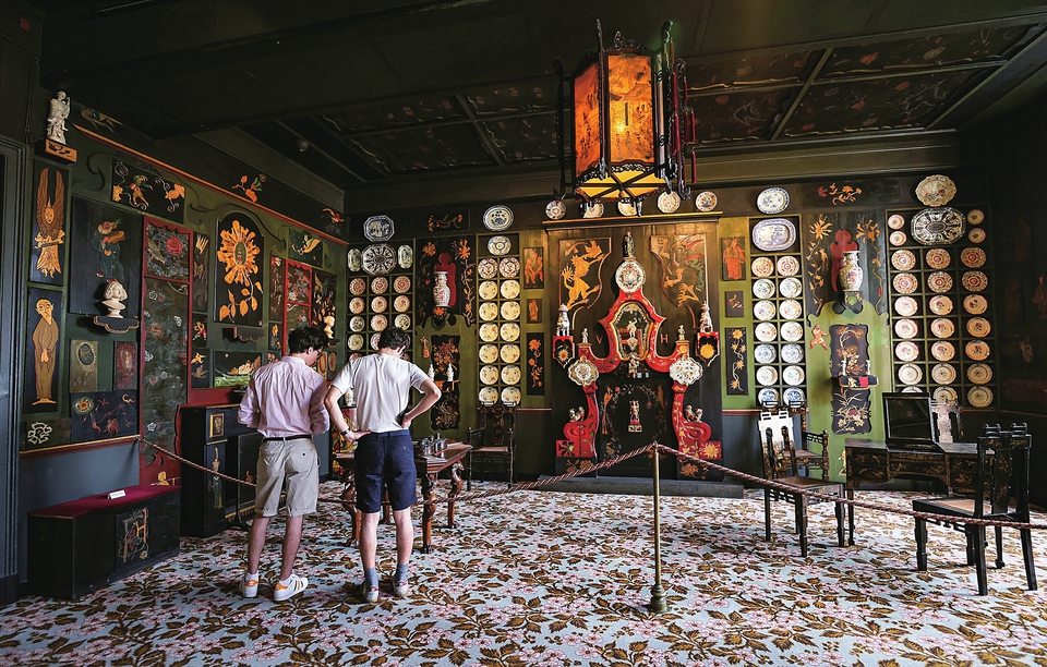 奥迪内介绍说,“中国客厅”房间的装饰,体现了雨果和德鲁埃对中国文化共同的喜爱和欣赏。雨果无论在巴黎还是在流亡根西岛期间,都不断收集中国艺术品。然后,他借鉴“中国元素”装饰德鲁埃的房间。房间内的木刻和漆器上的图案都是雨果本人绘制后,请根西岛的木匠进行雕刻。“雨果受中国家具、瓷器上人物、花鸟图案的启发,借鉴中国艺术的笔触进行再创作,他沉浸在一种中国画家的感觉中。”奥迪内说。
