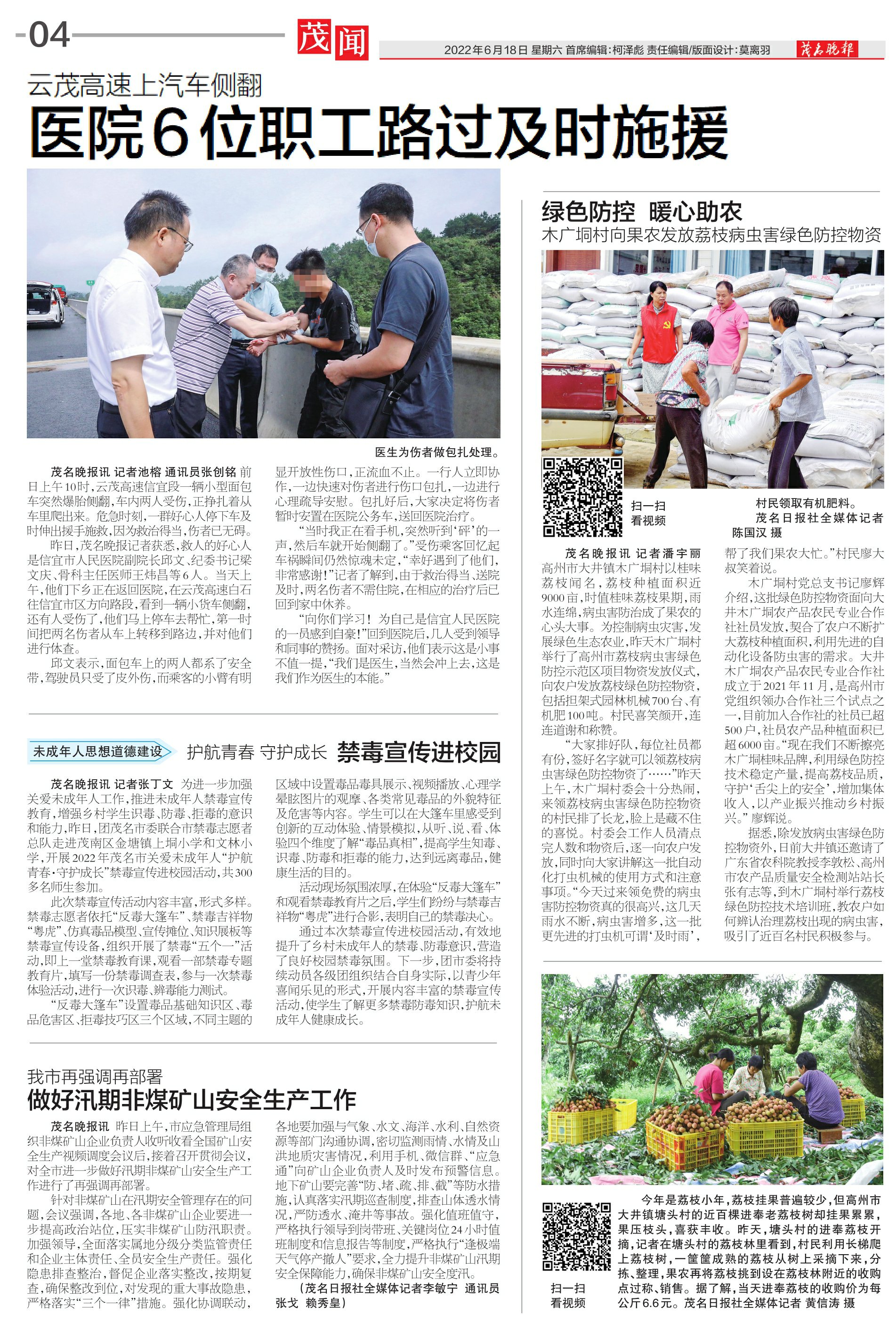 昨日,茂名晚报记者获悉,救人的好心人是信宜市人民医院副院长邱文、纪委书记梁文庆、骨科主任医师王炜昌等6人。当天上午,他们下乡正在返回医院,在云茂高速白石往信宜市区方向路段,看到一辆小货车侧翻,还有人受伤了,他们马上停车去帮忙,第一时间把两名伤者从车上转移到路边,并对他们进行体查。