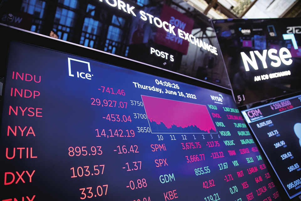 6月16日,美国纽约证券交易所的电子屏幕上显示交易信息。新华社发(郭克摄)