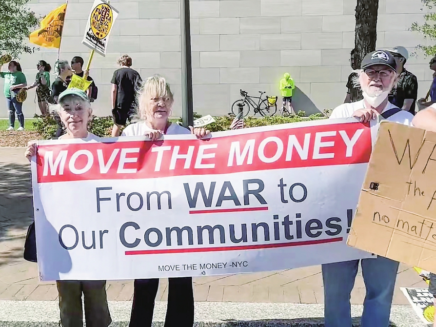 示威现场还有不少人要求美国政府削减军费开支,把纳税人的钱投入到教育、医疗、住房、交通等公共服务项目上,服务于大众。