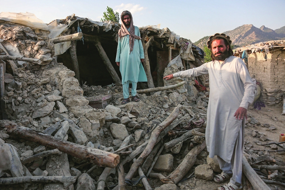 6月26日,在阿富汗霍斯特省,人们站在废墟之中。新华社发(塞夫拉赫曼·萨菲摄)