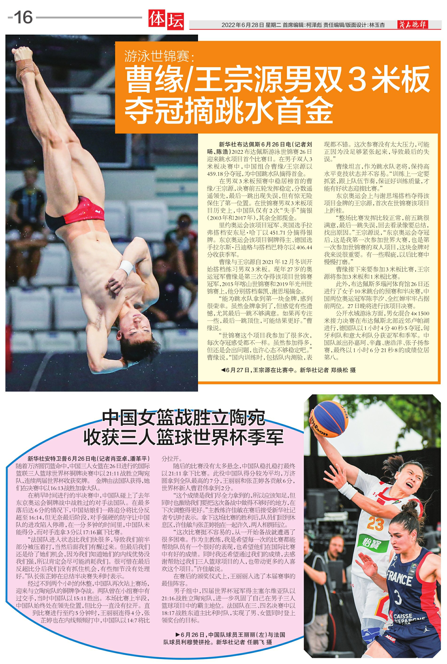 游泳世锦赛:曹缘/王宗源男双3米板夺冠摘跳水首金