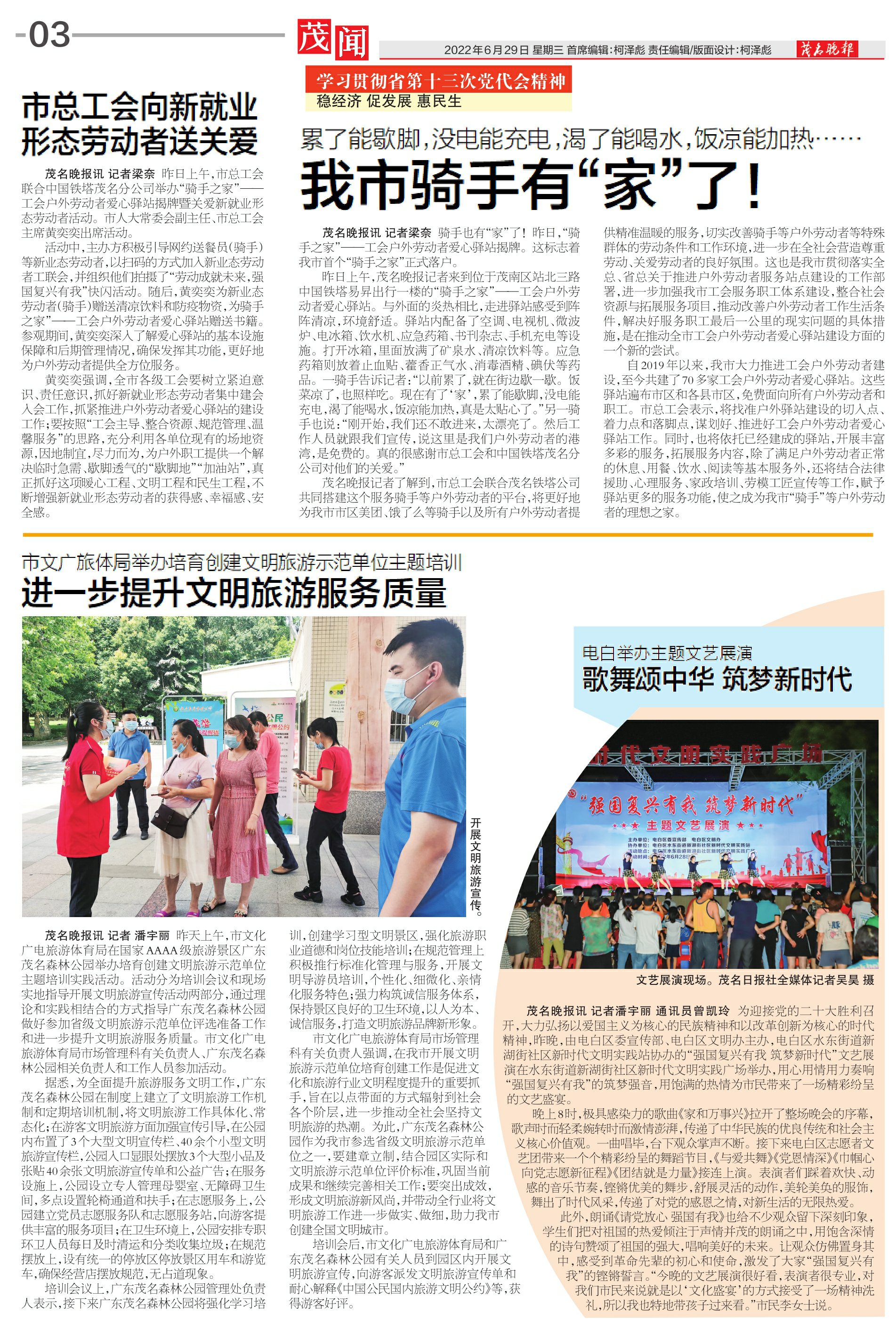 茂名晚报讯记者梁奈 昨日上午,市总工会联合中国铁塔茂名分公司举办“骑手之家”——工会户外劳动者爱心驿站揭牌暨关爱新就业形态劳动者活动。市人大常委会副主任、市总工会主席黄奕奕出席活动。