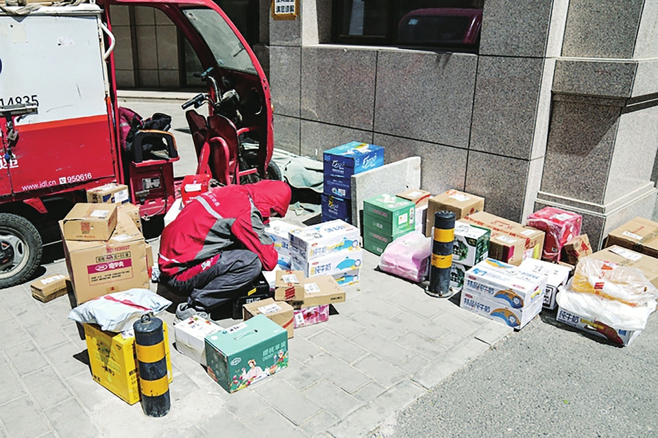 2022年4月26日,在北京市一小区门口,快递员在整理货品准备投递。新华社记者彭子洋摄