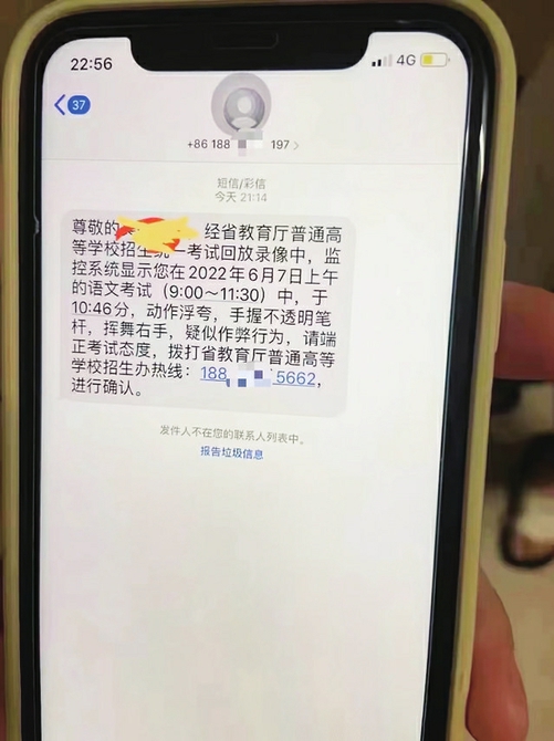 “尊敬的考生×××,经省教育厅普通高等学校招生统一考试回放录像中,监控系统显示您在2022年6月7日上午的语文考试(9:00—11:30)中,于10时46分,动作浮夸,手握不透明笔杆,挥舞右手,疑似作弊行为,请端正考试态度,拨打省教育厅普通高等学校招生办热线:188×××进行确认。”近日,有考生向厦门警方反映,自己接到了声称是“省教育厅普通高等学校招生办”的通知短信,怀疑是诈骗信息。该短信在开头准确写明了考生姓名,并在结尾要求考生主动拨电话号码进行确认。经与教育部门核实确认,高考作弊违规行为不会以短信、电话、链接等方式通知。厦门警方提醒,不法分子通过非正常渠道搜集到考生信息,并向考生发送所谓“疑似作弊”的通知短信,考生一旦回拨电话,就可能被不法分子以“处理作弊行为”为由实施诈骗。