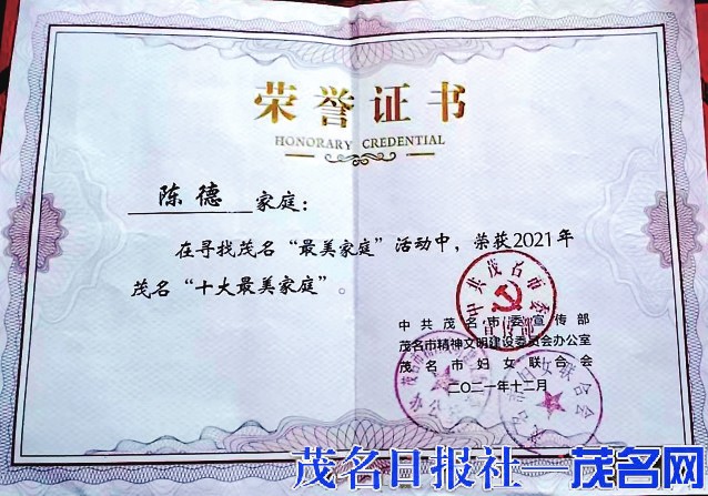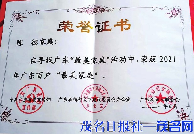 陈德的儿媳黄苑婷是梅州人,在深圳与陈星宇认识后,她在陈星宇口中了解到茂名,也让她对茂名有了好感。黄苑婷说:“我和我老公也是经人介绍认识的,后来通过深入交往发现他是一个很有责任心的人,再后来深入了解了他的家庭后,发现他们家整个家风都很好,都很顾家、有责任心。”她表示,结婚后的生活更加证明自己选对了人,她也走上教师岗位,受家风的影响,她也成了更好的自己。她还开心地告诉记者,在疫情防控允许的条件下,她和丈夫寒暑假都会带着孩子一起回梅州,看望自己的父母与亲人。