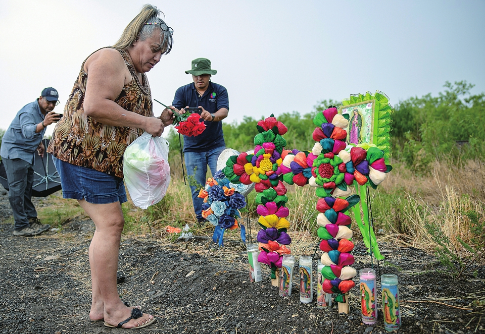 一名女子在美国得克萨斯州圣安东尼奥市货车惨案现场摆放塑料花束。新华社发(尼克·瓦格纳摄)