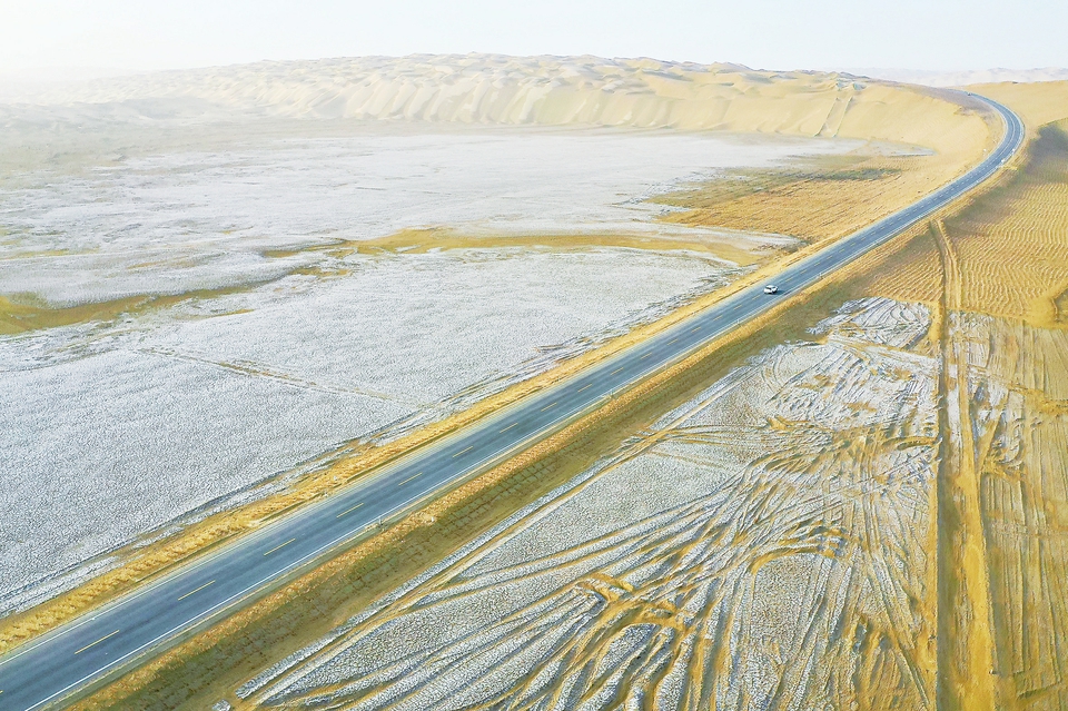 尉且沙漠公路2017年10月开工,是目前世界上流动沙丘分布最广、施工条件最恶劣、施工难度最大的沙漠公路之一。中国交建新疆尉且沙漠公路项目经理王云飞介绍,尉且沙漠公路解决了沙漠地区风积沙路基填筑关键技术难题。