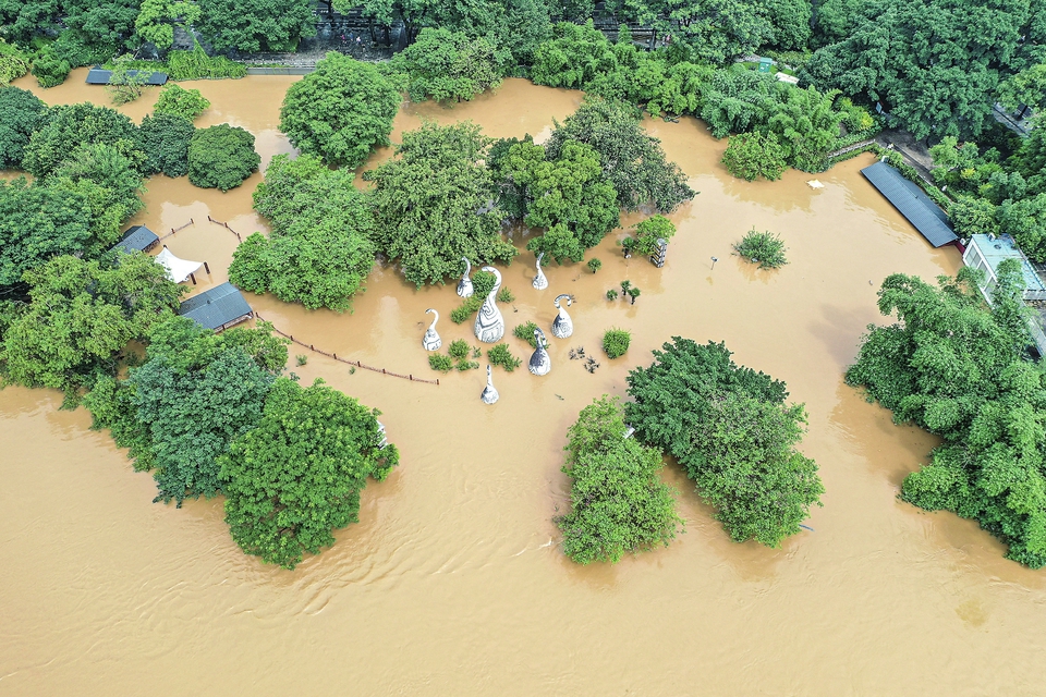 图为 6月22日拍摄的桂林市区一处被洪水淹没的公园(无人机照片)。新华社记者曹祎铭摄